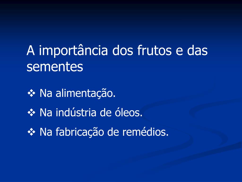 A importância dos frutos e das sementes • Na alimentação. • Na indústria de óleos. • Na fabricação de remédios.