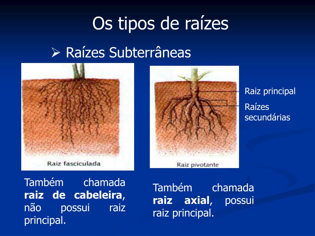 Os tipos de raízes • Raízes Subterrâneas Raiz principal Raízes secundárias Também chamada raiz de cabeleira, não possui raiz principal. Também chamada raiz axial, possui raiz principal.
