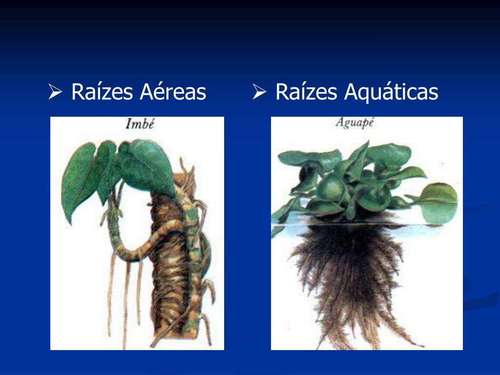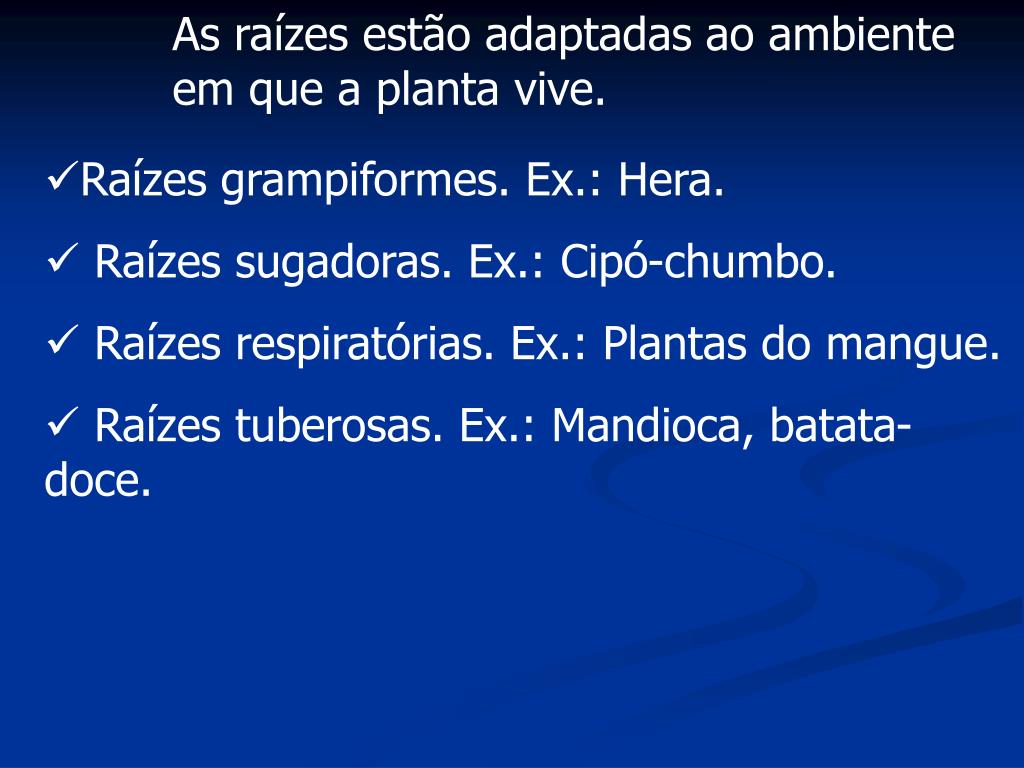 As raízes estão adaptadas ao ambiente em que a planta vive. • Raízes grampiformes. Ex.: Hera. • Raízes sugadoras. Ex.: Cipó-chumbo. • Raízes respiratórias. Ex.: Plantas do mangue. • Raízes tuberosas. Ex.: Mandioca, batata-doce.