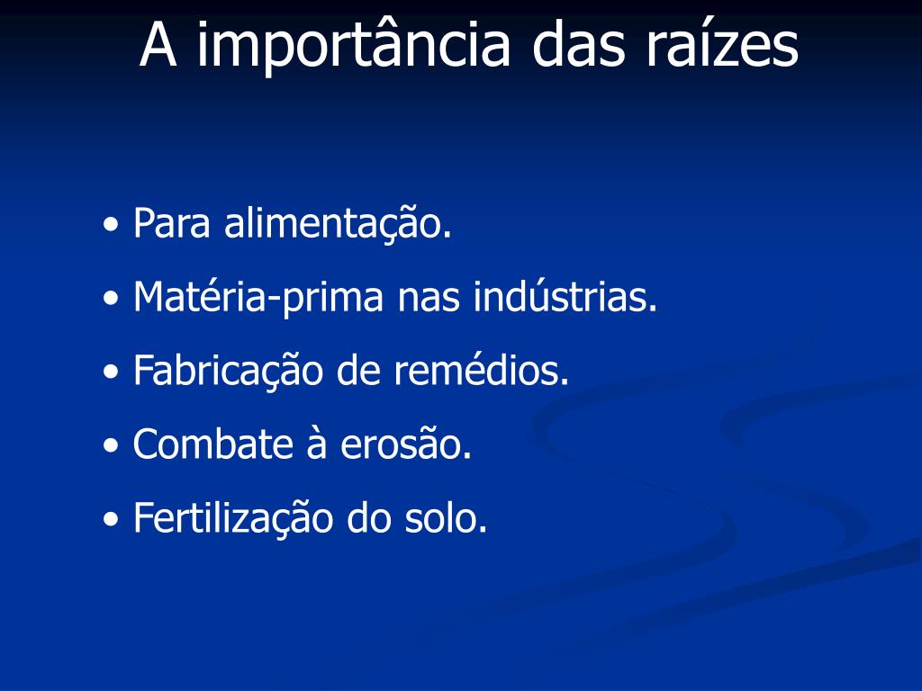 A importância das raízes • Para alimentação. • Matéria-prima nas indústrias. • Fabricação de remédios. • Combate à erosão. • Fertilização do solo.