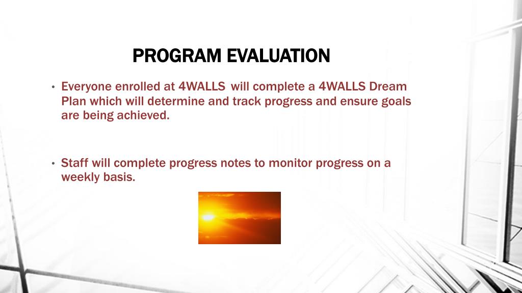 PROGRAM EVALUATION • Everyone enrolled at 4WALLSwill complete a 4WALLS Dream Plan which will determine and track progress and ensure goals are being achieved. • Staff will complete progress notes to monitor progress on a weekly basis.