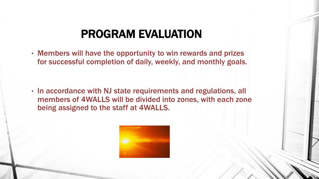 PROGRAM EVALUATION • Members will have the opportunity to win rewards and prizes for successful completion of daily, weekly, and monthly goals. • In accordance with NJ state requirements and regulations, all members of 4WALLS will be divided into zones, with each zone being assigned to the staff at 4WALLS.