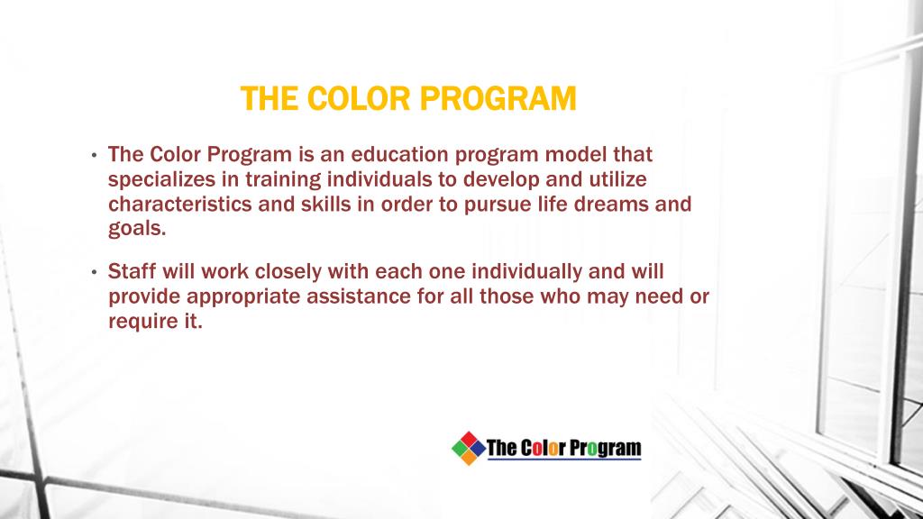 THE COLOR PROGRAM • The Color Program is an education program model that specializes in training individuals to develop and utilize characteristics and skills in order to pursue life dreams and goals. • Staff will work closely with each one individually and will provide appropriate assistance for all those who may need or require it.