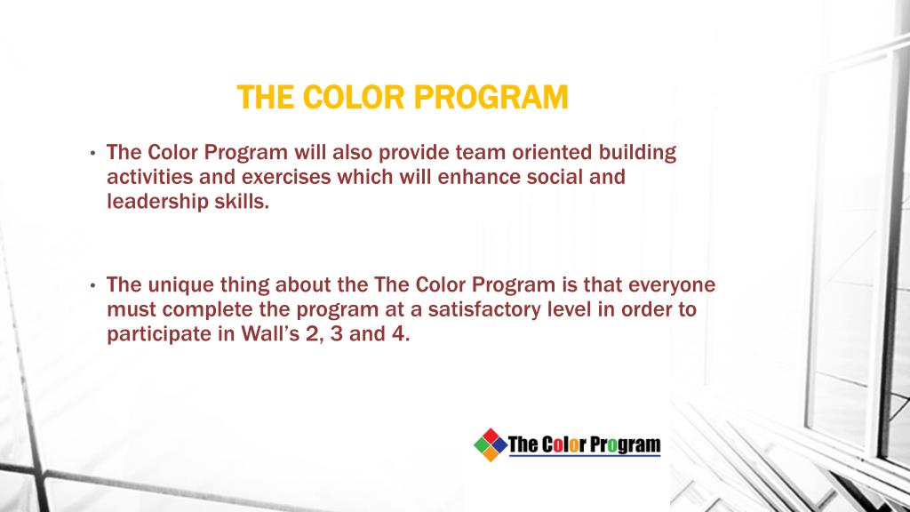 THE COLOR PROGRAM • The Color Program will also provide team oriented building activities and exercises which will enhance social and leadership skills. • The unique thing about the The Color Program is that everyone must complete the program at a satisfactory level in order to participate in Wall’s 2, 3 and 4.