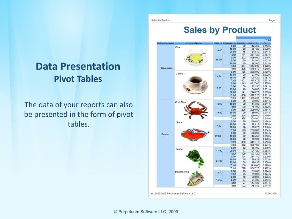 Data PresentationPivot Tables The data of your reports can also be presented in the form of pivot tables.