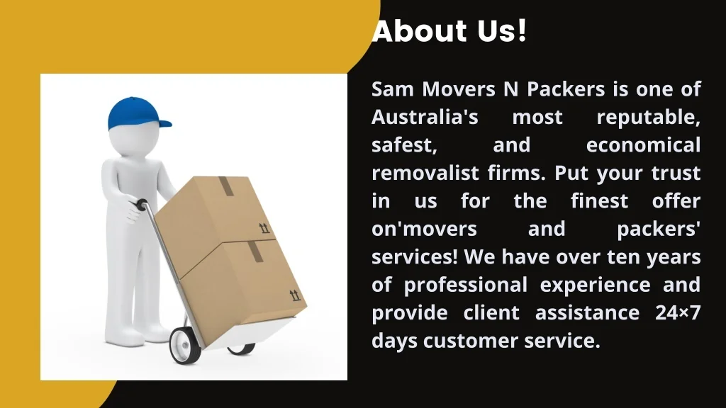 About Us! Sam Movers N Packers is one of Australia's most safest, and removalist firms. Put your trust in us for the finest offer on'movers and services! We have over ten years of professional experience and provide client assistance 24×7 days customer service. reputable, economical packers'