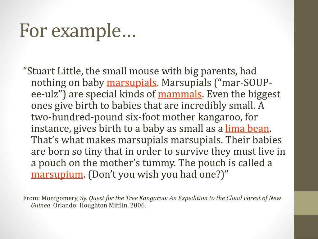 For example… “Stuart Little, the small mouse with big parents, had nothing on baby marsupials. Marsupials (“mar-SOUP-ee-ulz”) are special kinds of mammals. Even the biggest ones give birth to babies that are incredibly small. A two-hundred-pound six-foot mother kangaroo, for instance, gives birth to a baby as small as a lima bean. That’s what makes marsupials marsupials. Their babies are born so tiny that in order to survive they must live in a pouch on the mother’s tummy. The pouch is called a marsupium. (Don’t you wish you had one?)” From: Montgomery, Sy. Quest for the Tree Kangaroo: An Expedition to the Cloud Forest of New Guinea. Orlando: Houghton Mifflin, 2006.