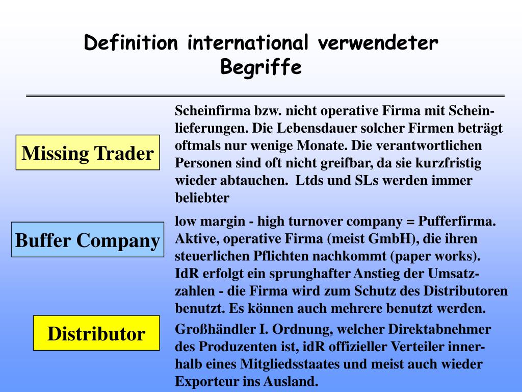 Definition international verwendeter Begriffe Scheinfirma bzw. nicht operative Firma mit Schein- lieferungen. Die Lebensdauer solcher Firmen beträgt oftmals nur wenige Monate. Die verantwortlichen Personen sind oft nicht greifbar, da sie kurzfristig wieder abtauchen. Ltds und SLs werden immer beliebter Missing Trader low margin - high turnover company = Pufferfirma. Aktive, operative Firma (meist GmbH), die ihren steuerlichen Pflichten nachkommt (paper works). IdR erfolgt ein sprunghafter Anstieg der Umsatz-zahlen - die Firma wird zum Schutz des Distributoren benutzt. Es können auch mehrere benutzt werden. Buffer Company Distributor Großhändler I. Ordnung, welcher Direktabnehmer des Produzenten ist, idR offizieller Verteiler inner- halb eines Mitgliedsstaates und meist auch wieder Exporteur ins Ausland.