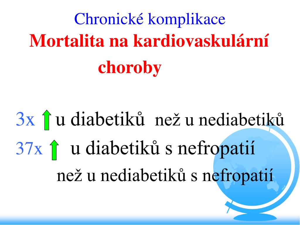 Chronické komplikace Mortalita na kardiovaskulární choroby 3x u diabetiků než u nediabetiků 37xu diabetiků s nefropatií než u nediabetiků s nefropatií