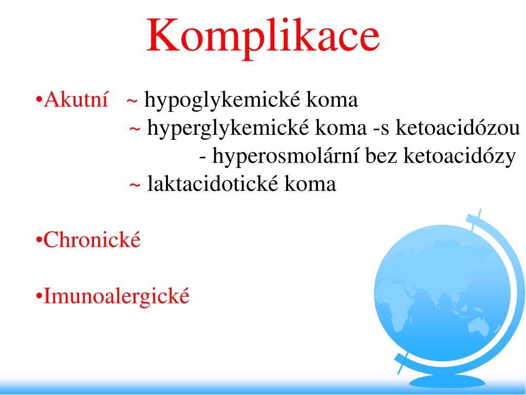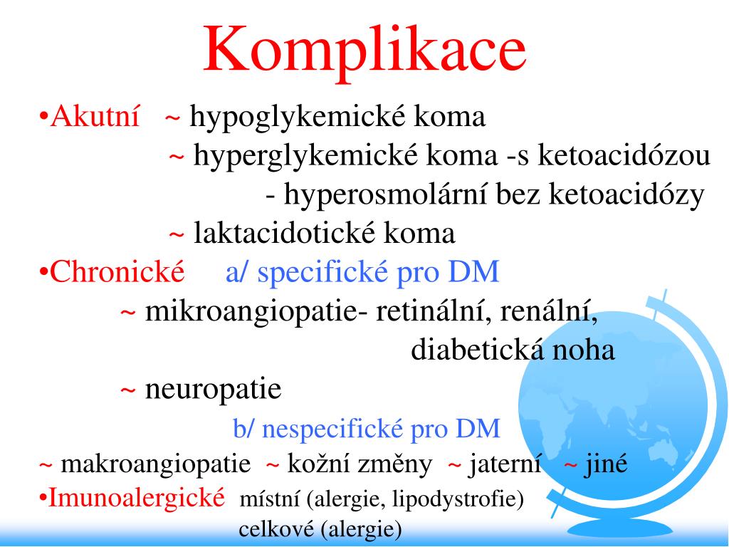 Komplikace • Akutní ~ hypoglykemické koma • ~ hyperglykemické koma -s ketoacidózou • - hyperosmolární bez ketoacidózy • ~ laktacidotické koma • Chronické a/ specifické pro DM • ~ mikroangiopatie- retinální, renální, • diabetická noha • ~ neuropatie • b/ nespecifické pro DM • ~ makroangiopatie ~ kožní změny ~ jaterní ~ jiné • Imunoalergické místní (alergie, lipodystrofie) • celkové (alergie)