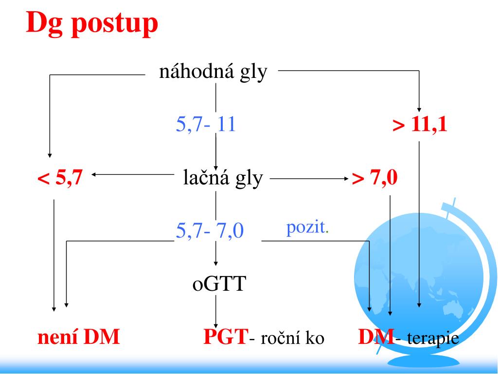 Dg postup náhodná gly 5,7-11 > 11,1 < 5,7 lačná gly > 7,0 5,7- 7,0 oGTT není DM PGT-roční ko DM-terapie pozit.