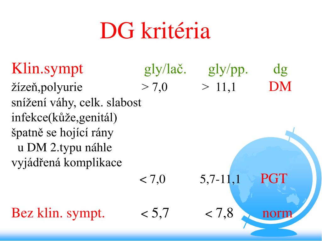 DG kritéria Klin.sympt gly/lač. gly/pp. dg žízeň,polyurie > 7,0 > 11,1 DM snížení váhy, celk. slabost infekce(kůže,genitál) špatně se hojící rány u DM 2.typu náhle vyjádřená komplikace < 7,0 5,7-11,1 PGT Bez klin. sympt. <5,7 < 7,8 norm