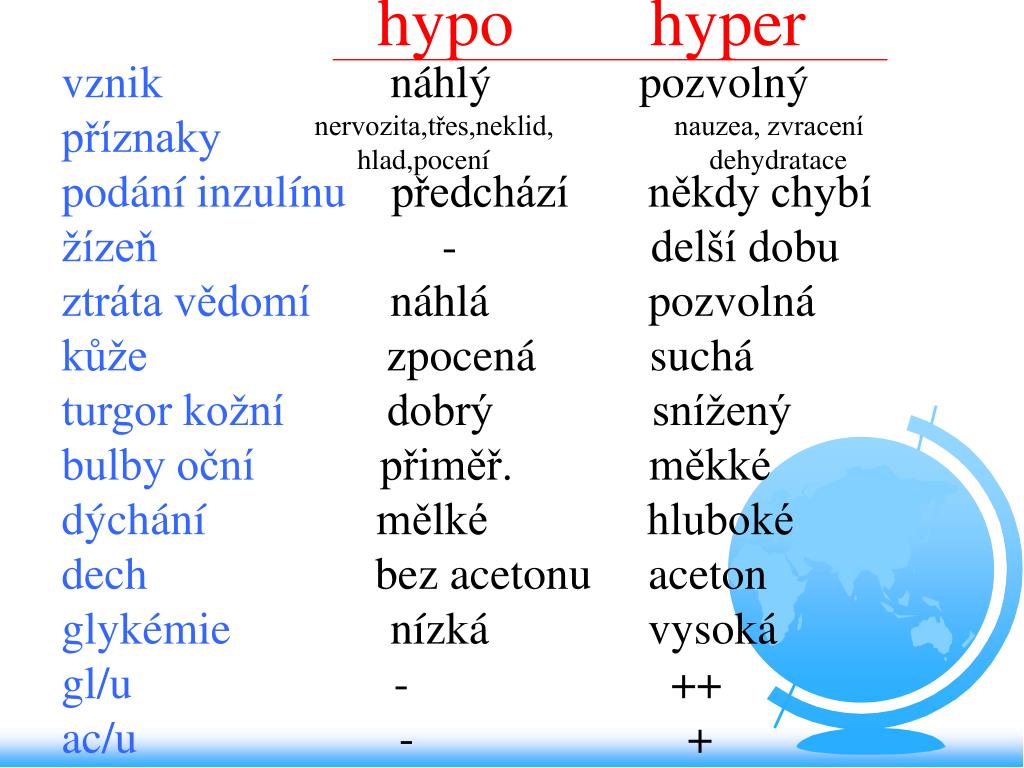 hypo hyper vznik náhlý pozvolný příznaky podání inzulínu předchází někdy chybí žízeň - delší dobu ztráta vědomí náhlá pozvolná kůže zpocená suchá turgor kožní dobrý snížený bulby oční přiměř. měkké dýchání mělké hluboké dech bez acetonu aceton glykémie nízká vysoká gl/u - ++ ac/u - + nervozita,třes,neklid, nauzea, zvracení hlad,pocení dehydratace