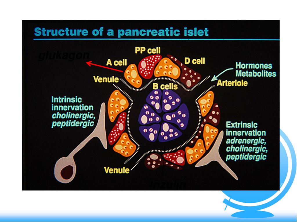 Protiinzulární hormony • Glukagon-A zvýš. glykogenolýza v játrech • STH,GHsniž. utilizaci glu • ACTHzvýš.glukokortikoidů • Glukokortikoidy zvýš.glukoneogeneze, zvýš.stim.inzulínu, sniž.perif. utilizaci glu • Adrenalin zvýš.glykogenolýza ve svalu, sníž.sekrece inzulínu • Hormony štítné žlázy • Somatostatin -D sníž. sekrece inzulínu • Pankreatický polypeptid ,VIP , Amylin -B sniž.sekreci inzulínu