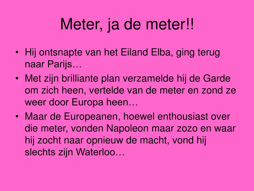 Meter, ja de meter!! • Hij ontsnapte van het Eiland Elba, ging terug naar Parijs… • Met zijn brilliante plan verzamelde hij de Garde om zich heen, vertelde van de meter en zond ze weer door Europa heen… • Maar de Europeanen, hoewel enthousiast over die meter, vonden Napoleon maar zozo en waar hij zocht naar opnieuw de macht, vond hij slechts zijn Waterloo…