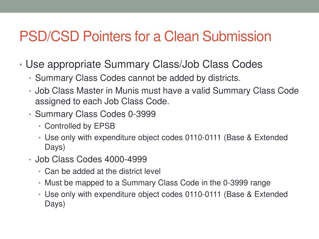 PSD/CSD Pointers for a Clean Submission • Use appropriate Summary Class/Job Class Codes • Summary Class Codes cannot be added by districts. • Job Class Master in Munis must have a valid Summary Class Code assigned to each Job Class Code. • Summary Class Codes 0-3999 • Controlled by EPSB • Use only with expenditure object codes 0110-0111 (Base & Extended Days) • Job Class Codes 4000-4999 • Can be added at the district level • Must be mapped to a Summary Class Code in the 0-3999 range • Use only with expenditure object codes 0110-0111 (Base & Extended Days)