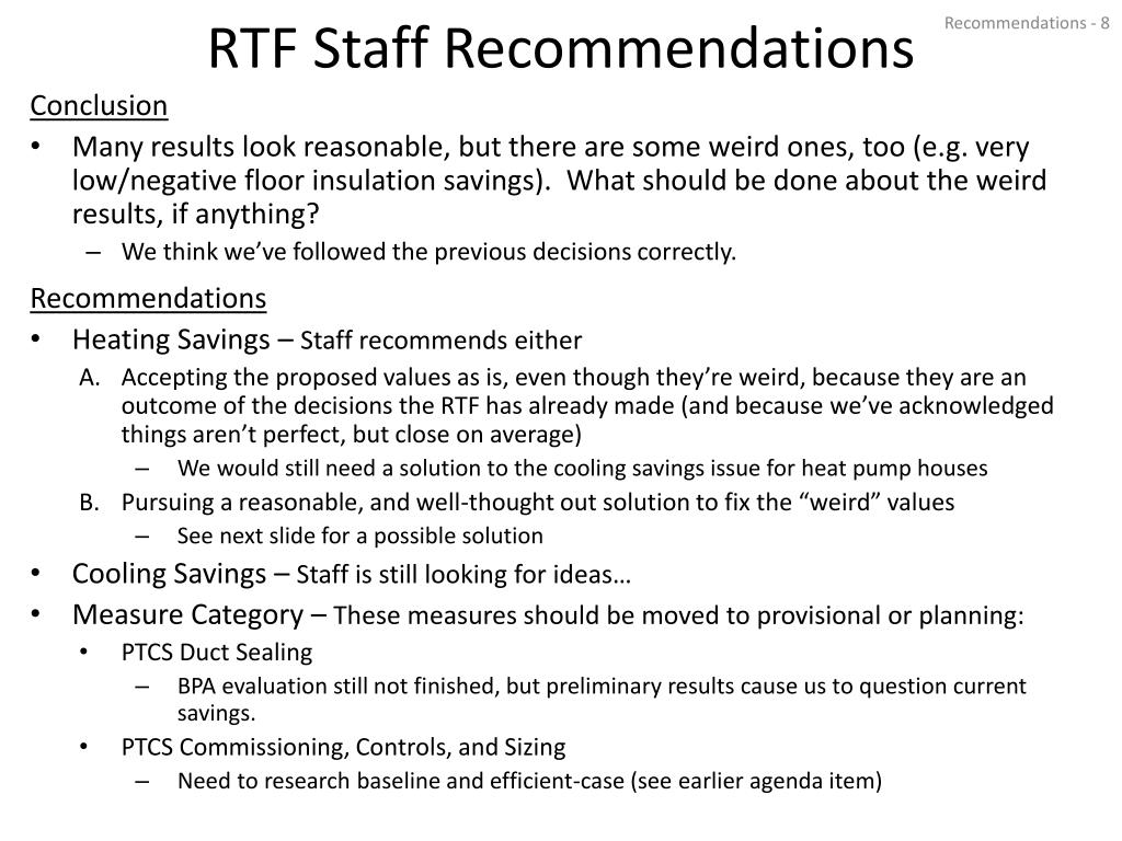 RTF Staff Recommendations Conclusion • Many results look reasonable, but there are some weird ones, too (e.g. very low/negative floor insulation savings). What should be done about the weird results, if anything? • We think we’ve followed the previous decisions correctly. Recommendations • Heating Savings – Staff recommends either • Accepting the proposed values as is, even though they’re weird, because they are an outcome of the decisions the RTF has already made (and because we’ve acknowledged things aren’t perfect, but close on average) • We would still need a solution to the cooling savings issue for heat pump houses • Pursuing a reasonable, and well-thought out solution to fix the “weird” values • See next slide for a possible solution • Cooling Savings – Staff is still looking for ideas… • Measure Category – These measures should be moved to provisional or planning: • PTCS Duct Sealing • BPA evaluation still not finished, but preliminary results cause us to question current savings. • PTCS Commissioning, Controls, and Sizing • Need to research baseline and efficient-case (see earlier agenda item)