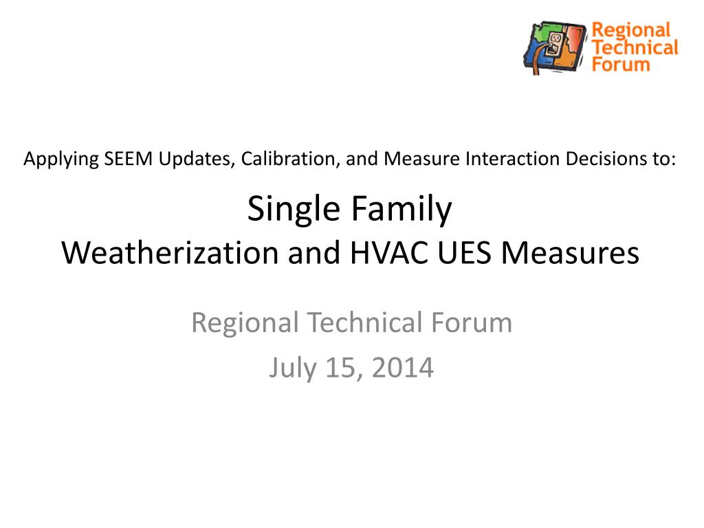 Applying SEEM Updates, Calibration, and Measure Interaction Decisions to: Single Family Weatherization and HVAC UES Measures. Regional Technical Forum July 15, 2014. Presentation Outline. Measure Overview Staff Highlighted Areas Looking Ahead – Staff Recommendations Measure Analysis