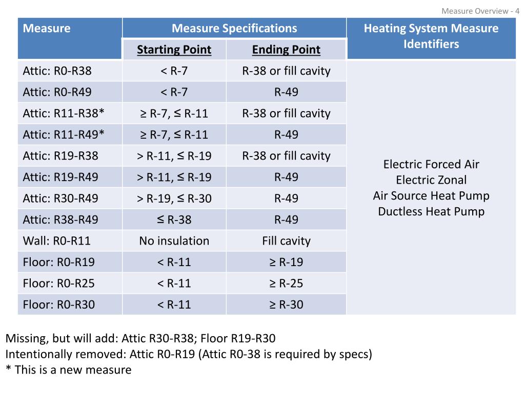 Missing, but will add: Attic R30-R38; Floor R19-R30 Intentionally removed: Attic R0-R19 (Attic R0-38 is required by specs) * This is a new measure