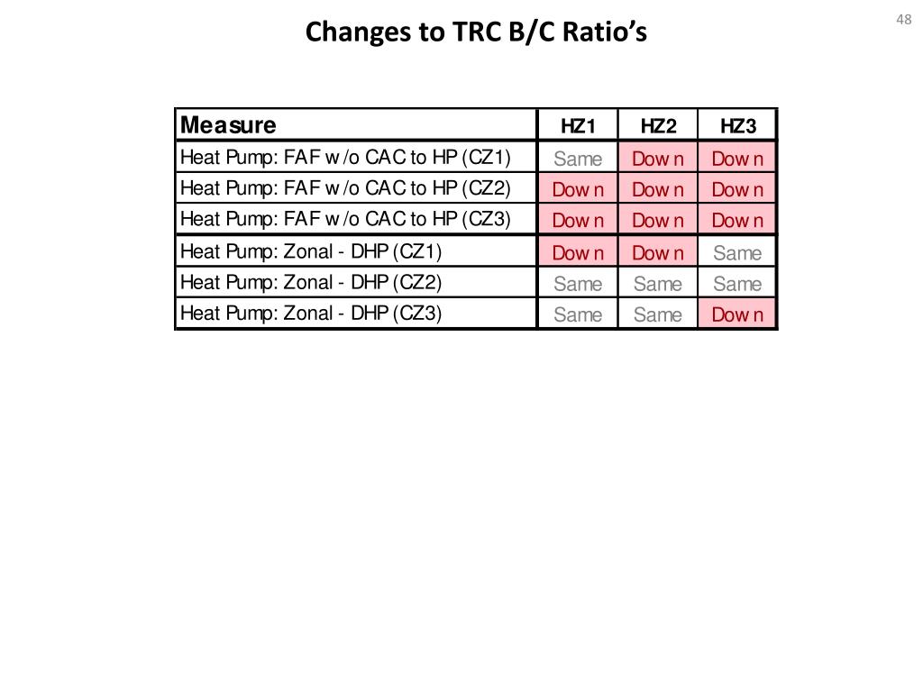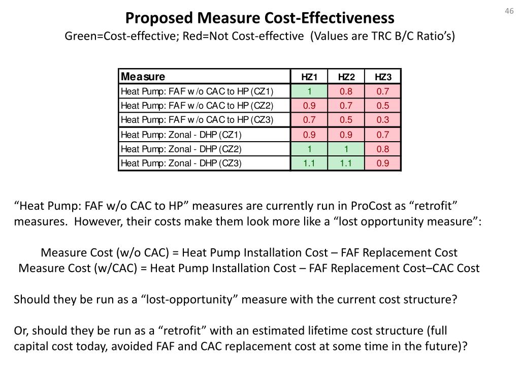 Proposed Measure Cost-Effectiveness Green=Cost-effective; Red=Not Cost-effective (Values are TRC B/C Ratio’s) “Heat Pump: FAF w/o CAC to HP” measures are currently run in ProCost as “retrofit” measures. However, their costs make them look more like a “lost opportunity measure”: Measure Cost (w/o CAC) = Heat Pump Installation Cost – FAF Replacement Cost Measure Cost (w/CAC) = Heat Pump Installation Cost – FAF Replacement Cost–CAC Cost Should they be run as a “lost-opportunity” measurewith the current cost structure? Or, should they be run as a “retrofit” with an estimated lifetime cost structure (full capital cost today, avoided FAF and CAC replacement cost at some time in the future)?