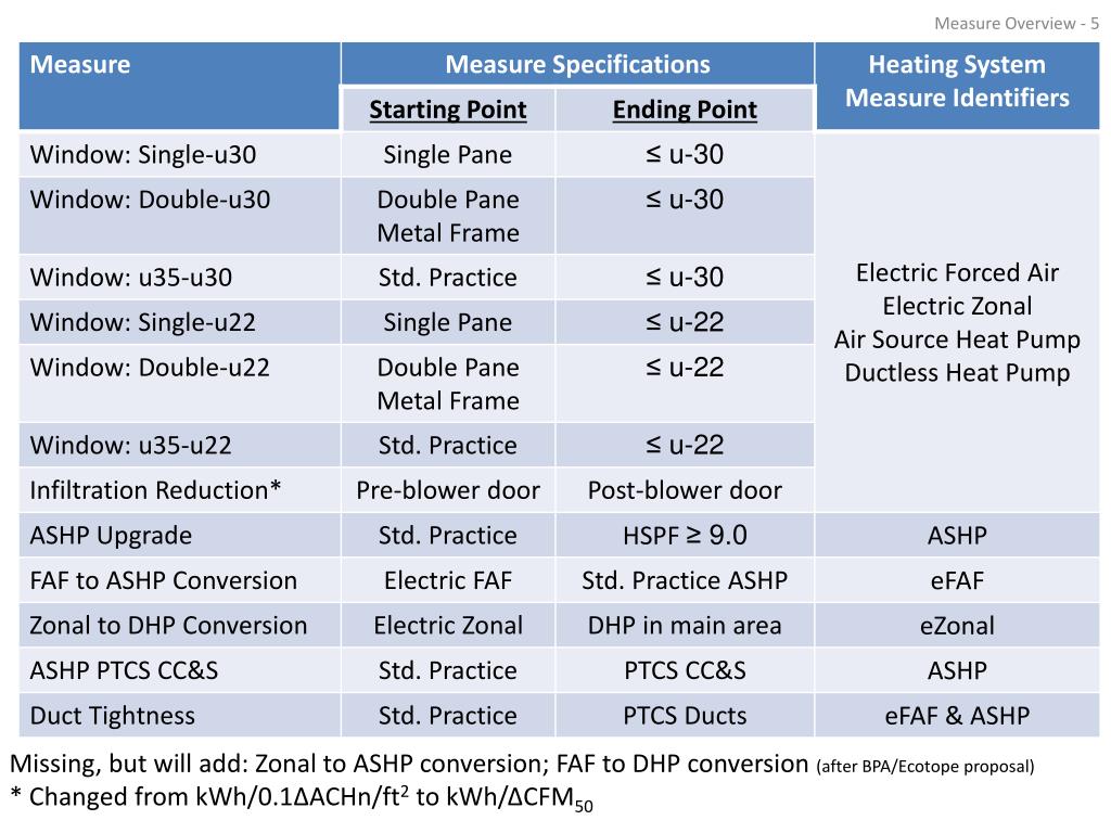 Missing, but will add: Zonal to ASHP conversion; FAF to DHP conversion (after BPA/Ecotope proposal) * Changed from kWh/0.1ΔACHn/ft2 to kWh/ΔCFM50
