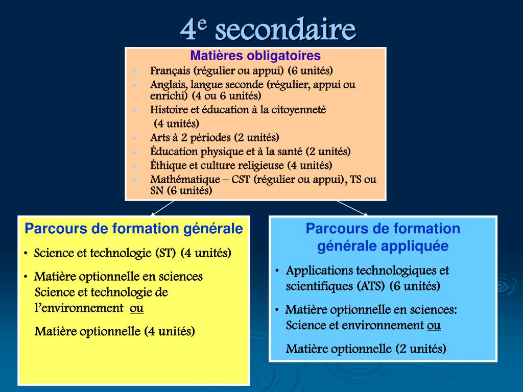 4e secondaire Matières obligatoires • Français (régulier ou appui) (6 unités) • Anglais, langue seconde (régulier, appui ou enrichi) (4 ou 6 unités) • Histoire et éducation à la citoyenneté (4 unités) • Arts à 2 périodes (2 unités) • Éducation physique et à la santé (2 unités) • Éthique et culture religieuse (4 unités) • Mathématique – CST (régulier ou appui), TS ou SN (6 unités) • Parcours de formation générale • Science et technologie (ST) (4 unités) • Matière optionnelle en sciences Science et technologie de l’environnement ou • Matière optionnelle (4 unités) • Parcours de formation générale appliquée • Applications technologiques et scientifiques (ATS) (6 unités) • Matière optionnelle en sciences: Science et environnement ou • Matière optionnelle (2 unités)