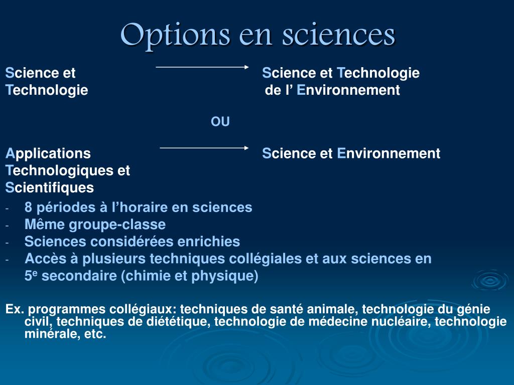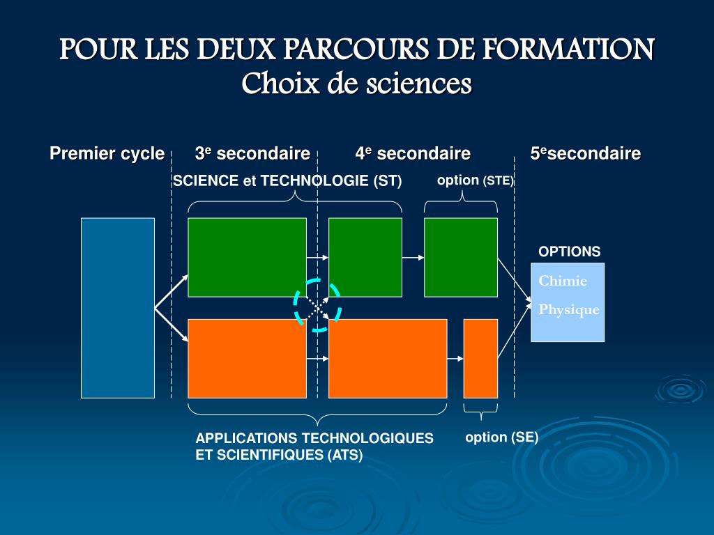 Premier cycle 3e secondaire 4e secondaire 5esecondaire SCIENCE et TECHNOLOGIE (ST) option (STE) OPTIONS option (SE) APPLICATIONS TECHNOLOGIQUES ET SCIENTIFIQUES (ATS) POUR LES DEUX PARCOURS DE FORMATIONChoix de sciences Chimie Physique