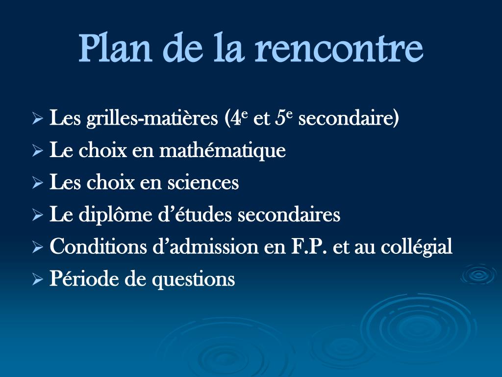 Plan de la rencontre • Les grilles-matières (4e et 5e secondaire) • Le choix en mathématique • Les choix en sciences • Le diplôme d’études secondaires • Conditions d’admission en F.P. et au collégial • Période de questions