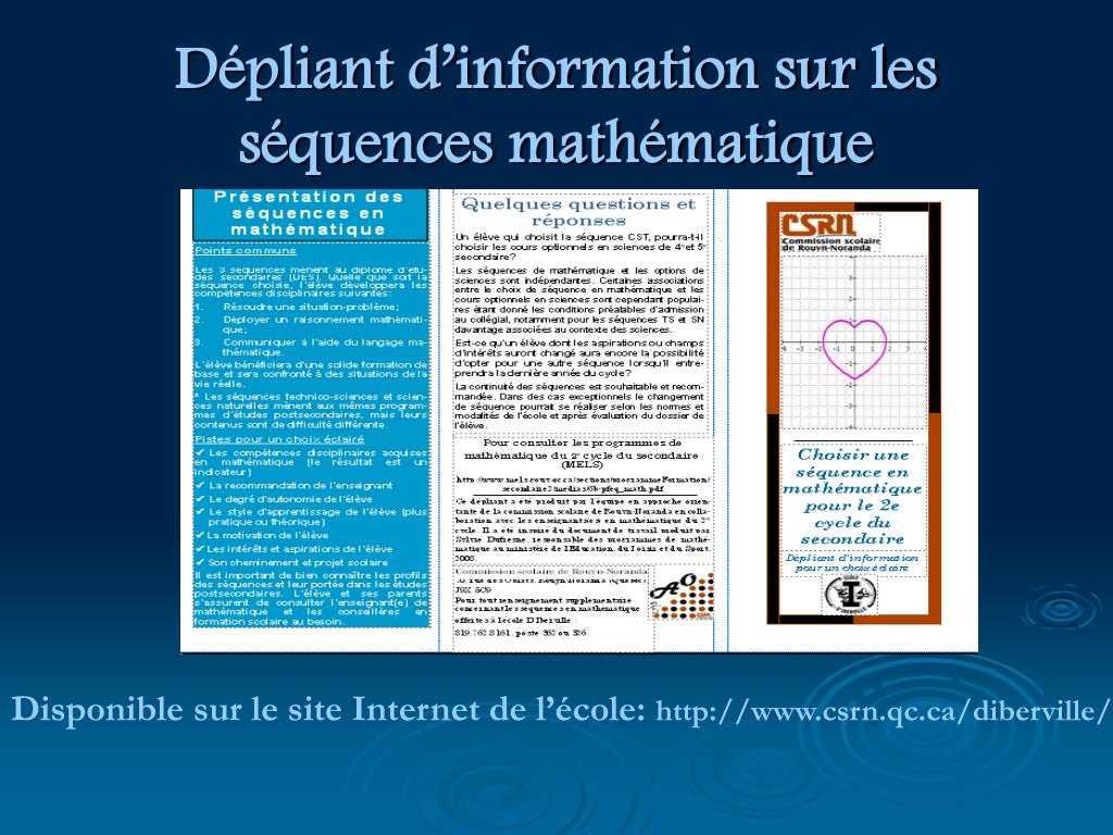 Dépliant d’information sur les séquences mathématique Disponible sur le site Internet de l’école: http://www.csrn.qc.ca/diberville/ Choisir une séquence en mathématique pour le 2e cycle du secondaire Choisir une séquence en mathématique pour le 2e cycle du secondaire Dépliant d’information pour un choix éclairé Dépliant d’information pour un choix éclairé