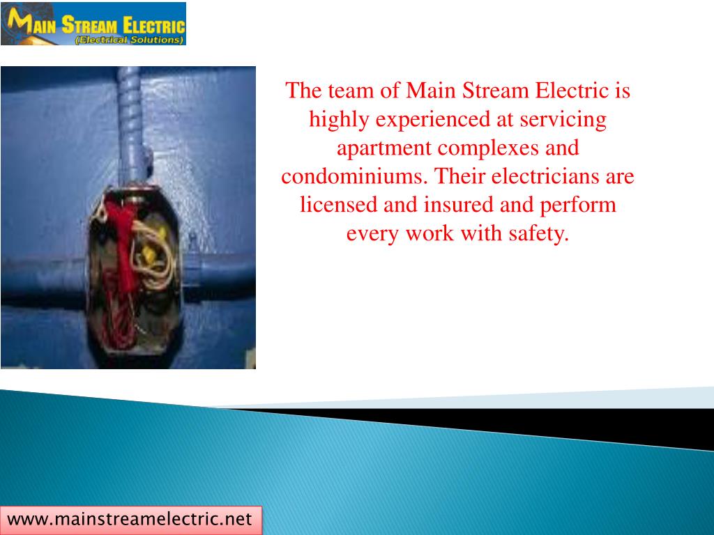 The team of Main Stream Electric is highly experienced at servicing apartment complexes and condominiums. Their electricians are licensed and insured and perform every work with safety.
