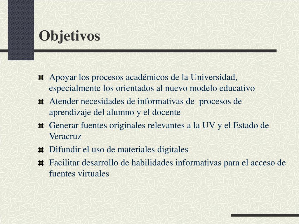Objetivos • Apoyar los procesos académicos de la Universidad, especialmente los orientados al nuevo modelo educativo • Atender necesidades de informativas de procesos de aprendizaje del alumno y el docente • Generar fuentes originales relevantes a la UV y el Estado de Veracruz • Difundir el uso de materiales digitales • Facilitar desarrollo de habilidades informativas para el acceso de fuentes virtuales