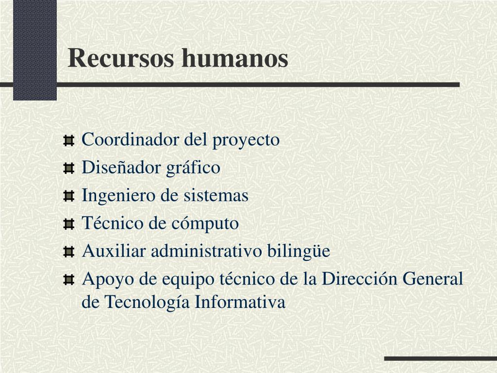 Recursos humanos • Coordinador del proyecto • Diseñador gráfico • Ingeniero de sistemas • Técnico de cómputo • Auxiliar administrativo bilingüe • Apoyo de equipo técnico de la Dirección General de Tecnología Informativa
