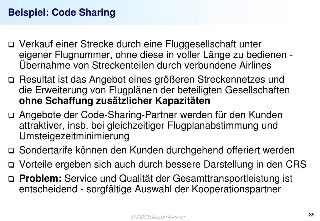 Beispiel: Code Sharing • Verkauf einer Strecke durch eine Fluggesellschaft unter eigener Flugnummer, ohne diese in voller Länge zu bedienen - Übernahme von Streckenteilen durch verbundene Airlines • Resultat ist das Angebot eines größeren Streckennetzes und die Erweiterung von Flugplänen der beteiligten Gesellschaften ohne Schaffung zusätzlicher Kapazitäten • Angebote der Code-Sharing-Partner werden für den Kunden attraktiver, insb. bei gleichzeitiger Flugplanabstimmung und Umsteigezeitminimierung • Sondertarife können den Kunden durchgehend offeriert werden • Vorteile ergeben sich auch durch bessere Darstellung in den CRS • Problem: Service und Qualität der Gesamttransportleistung ist entscheidend - sorgfältige Auswahl der Kooperationspartner