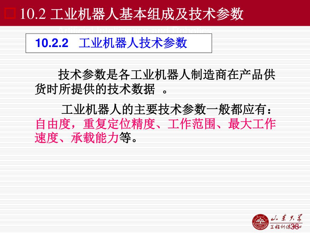 10.2 工业机器人基本组成及技术参数 10.2.2 工业机器人技术参数 技术参数是各工业机器人制造商在产品供货时所提供的技术数据 。 工业机器人的主要技术参数一般都应有:自由度,重复定位精度、工作范围、最大工作速度、承载能力等。