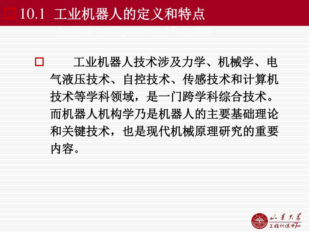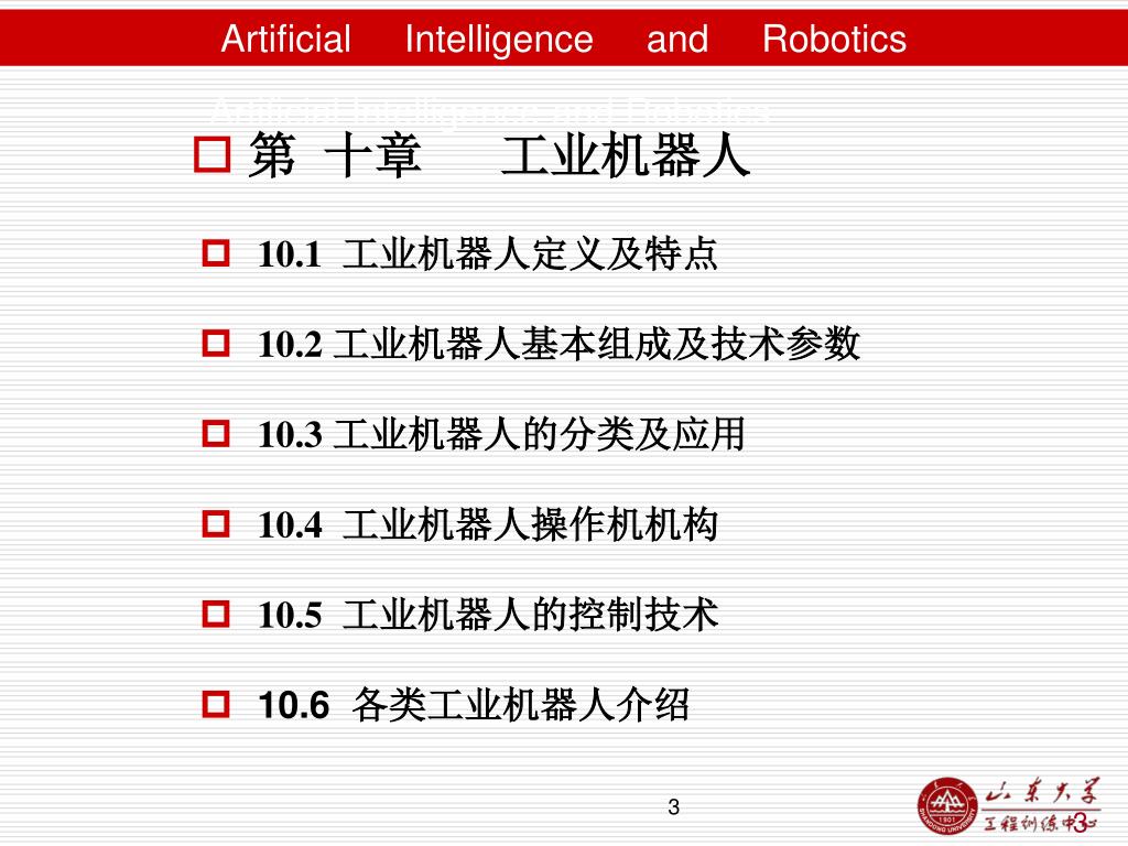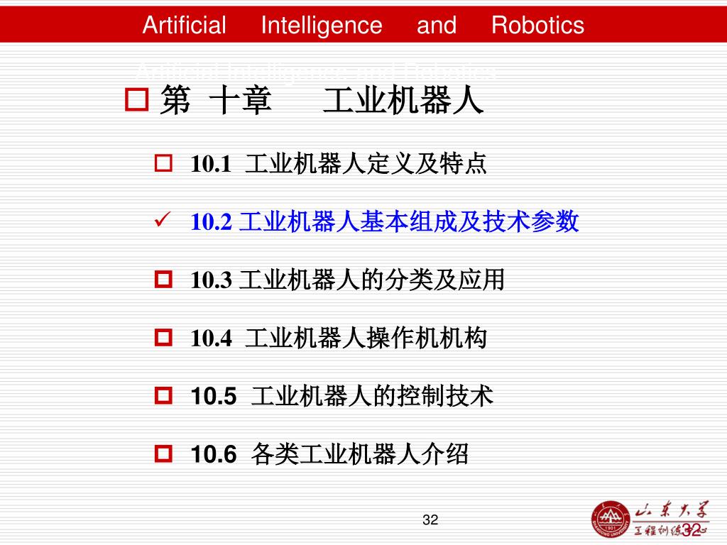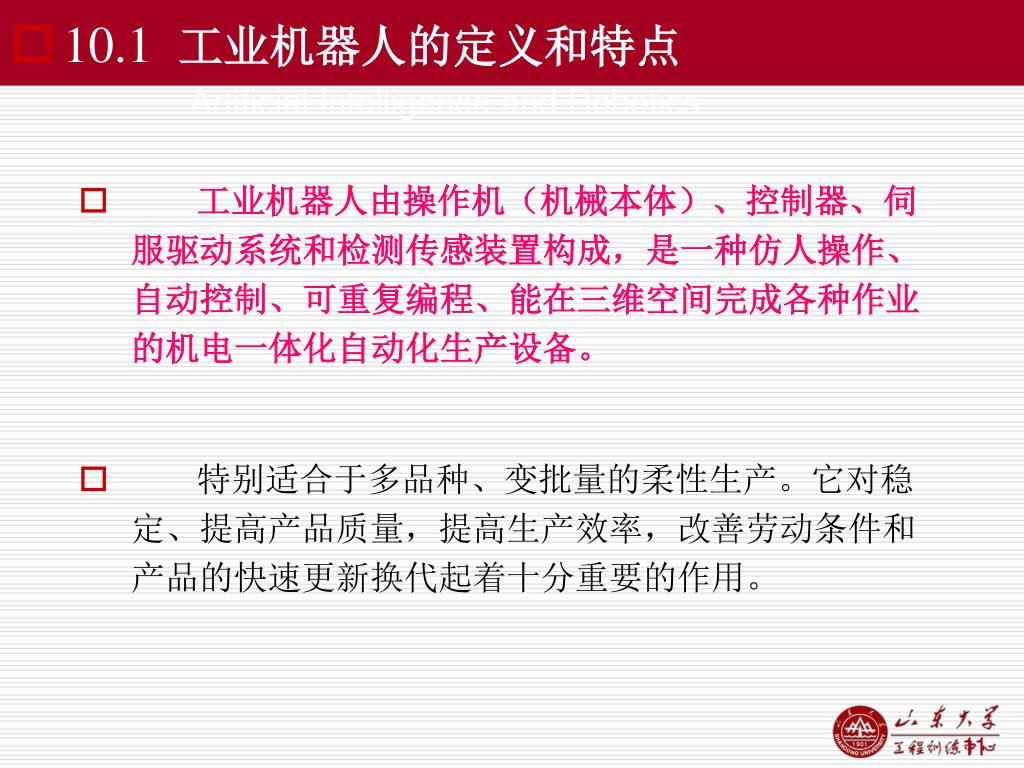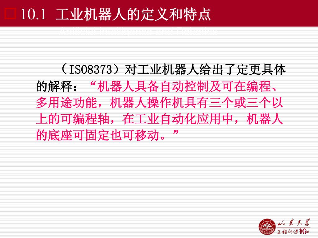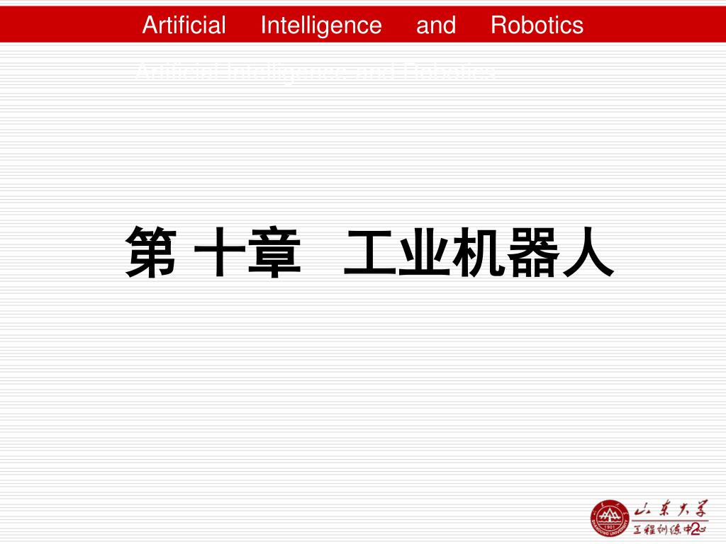 Artificial Intelligence and Robotics. 山东大学创新教育通识核心课程 人工智能与机器人 cyj@sdu.edu.cn 86358137 、 88399323 山东大学. Artificial Intelligence and Robotics. 第 十章 工业机器人. Artificial Intelligence and Robotics. 第 十章 工业机器人. 10.1 工业机器人定义及特点 10.2 工业机器人基本组成及技术参数