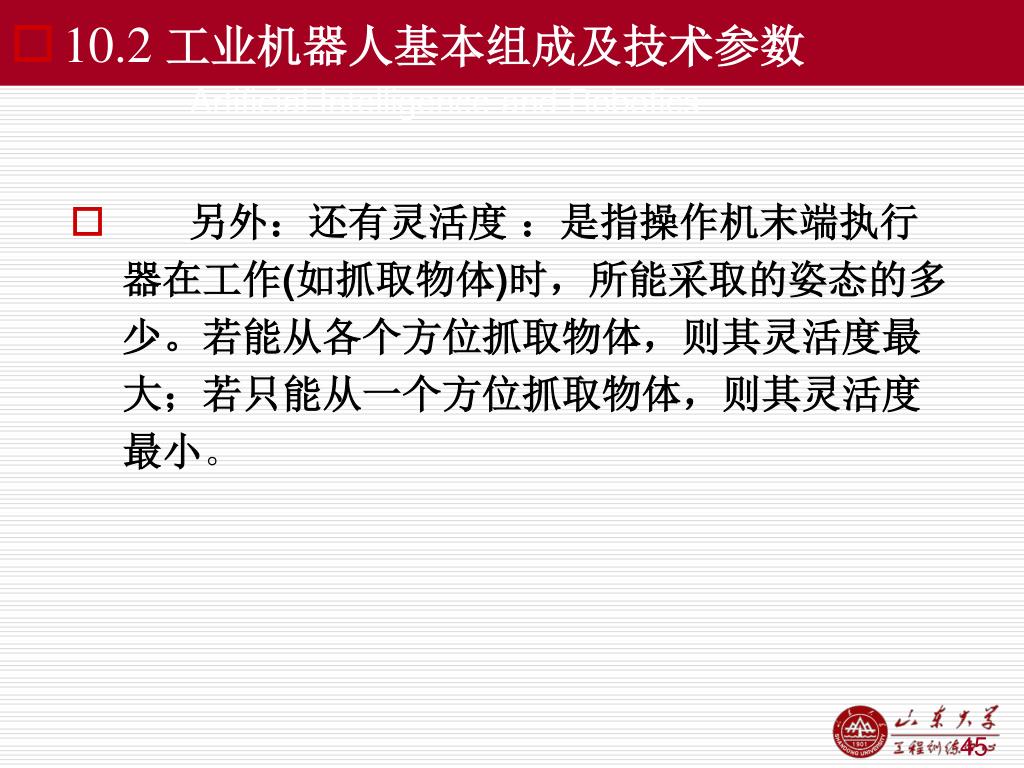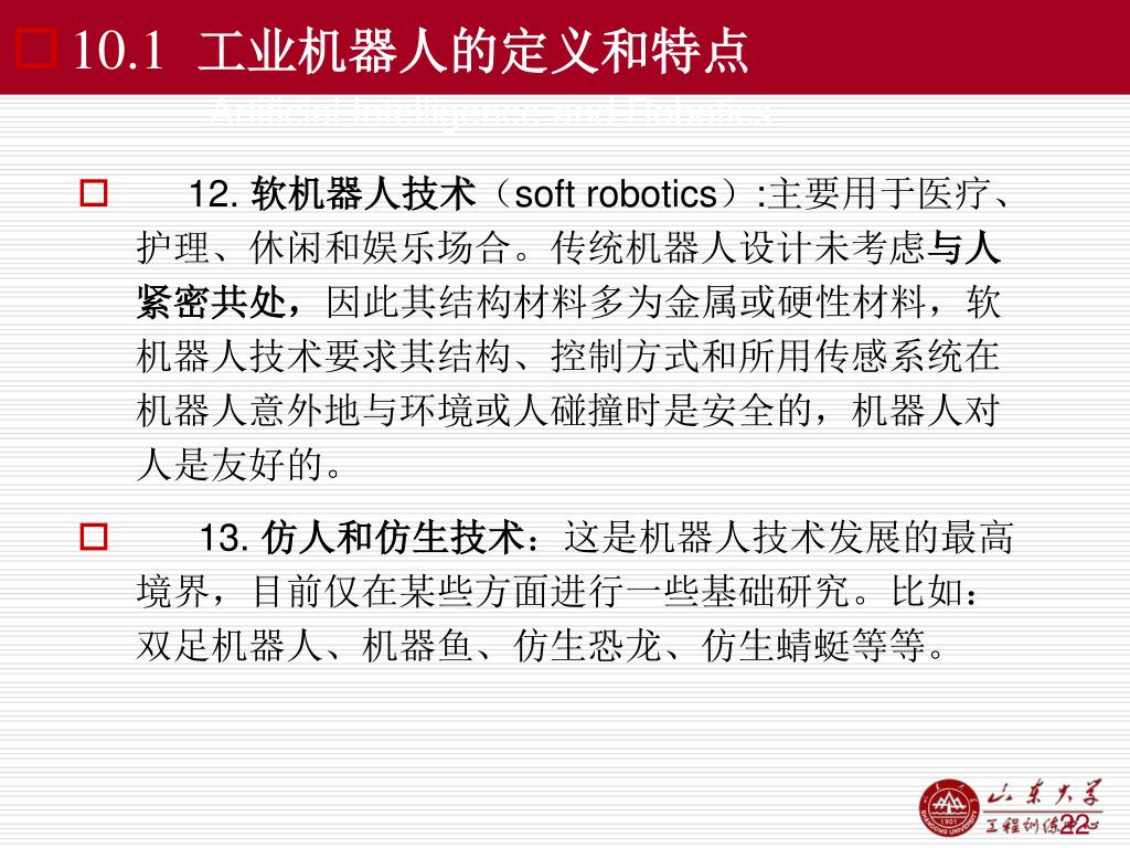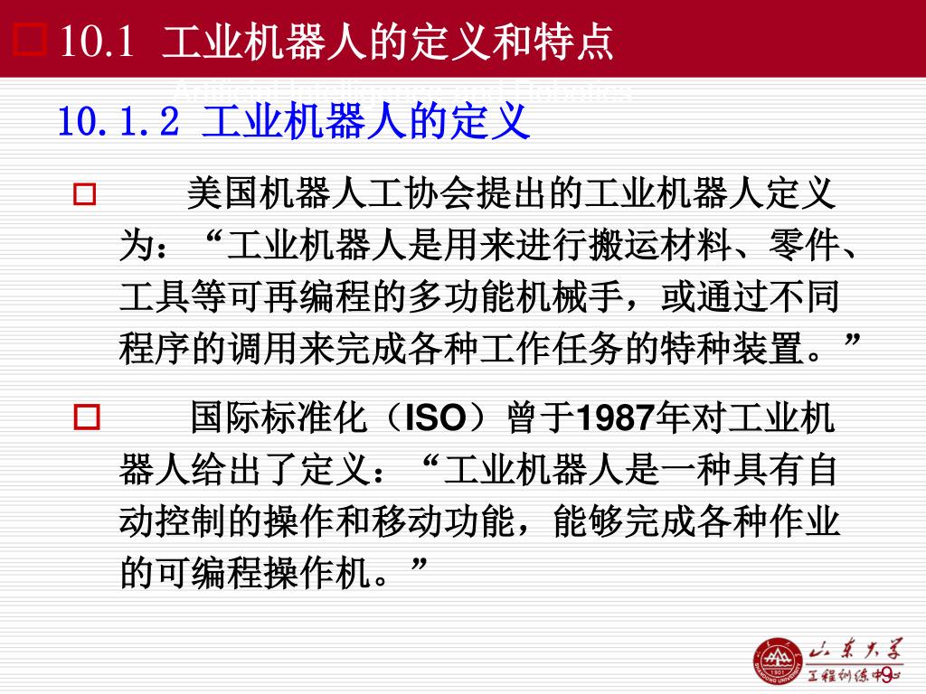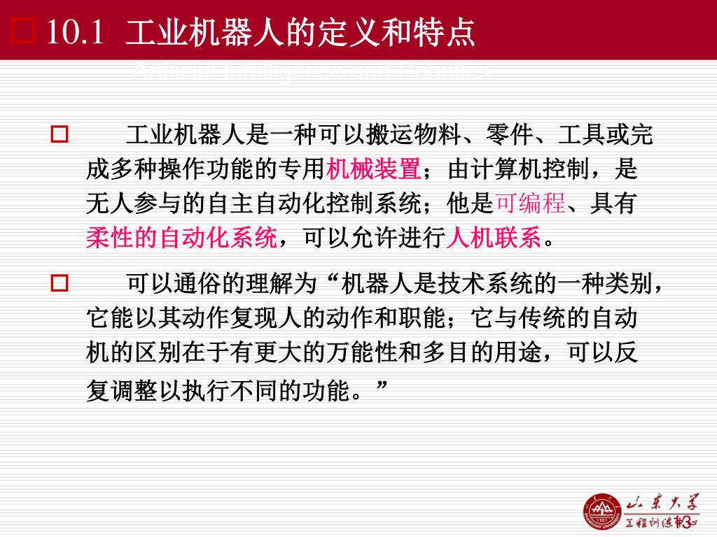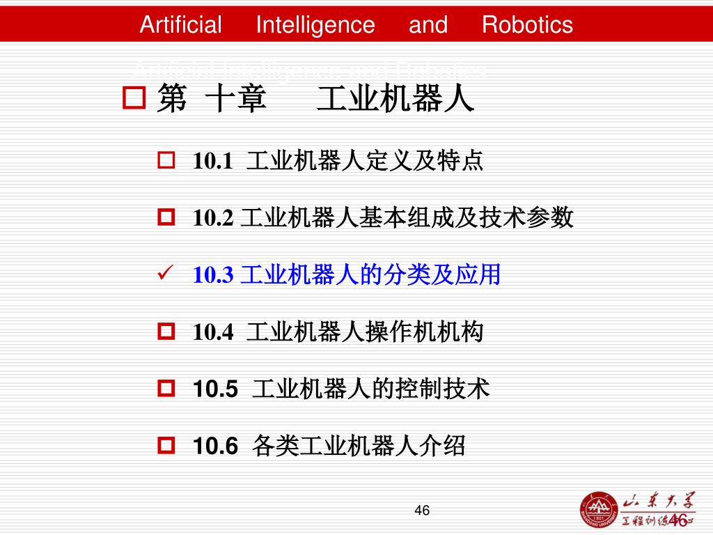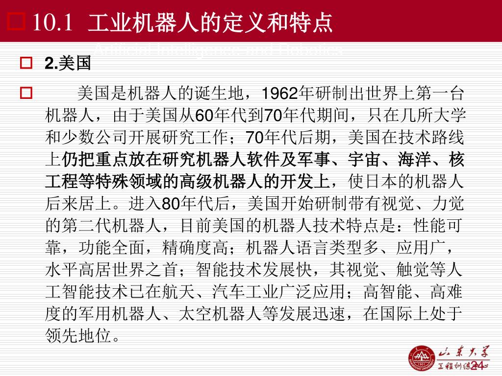 Artificial Intelligence and Robotics. 山东大学创新教育通识核心课程 人工智能与机器人 cyj@sdu.edu.cn 86358137 、 88399323 山东大学. Artificial Intelligence and Robotics. 第 十章 工业机器人. Artificial Intelligence and Robotics. 第 十章 工业机器人. 10.1 工业机器人定义及特点 10.2 工业机器人基本组成及技术参数