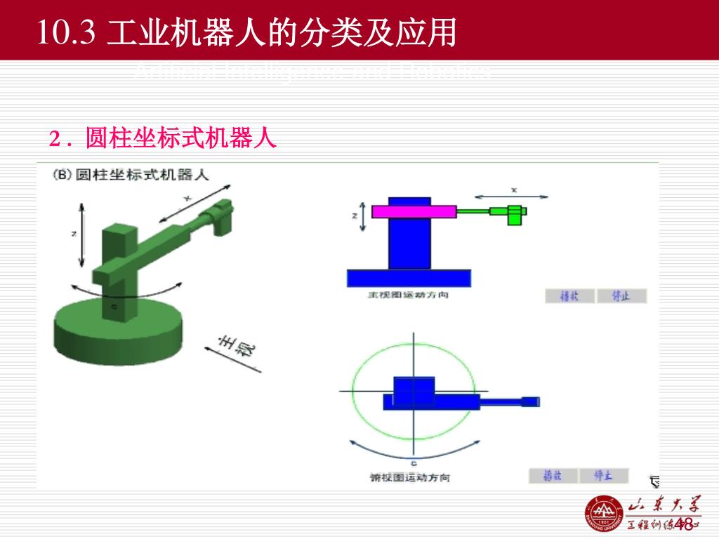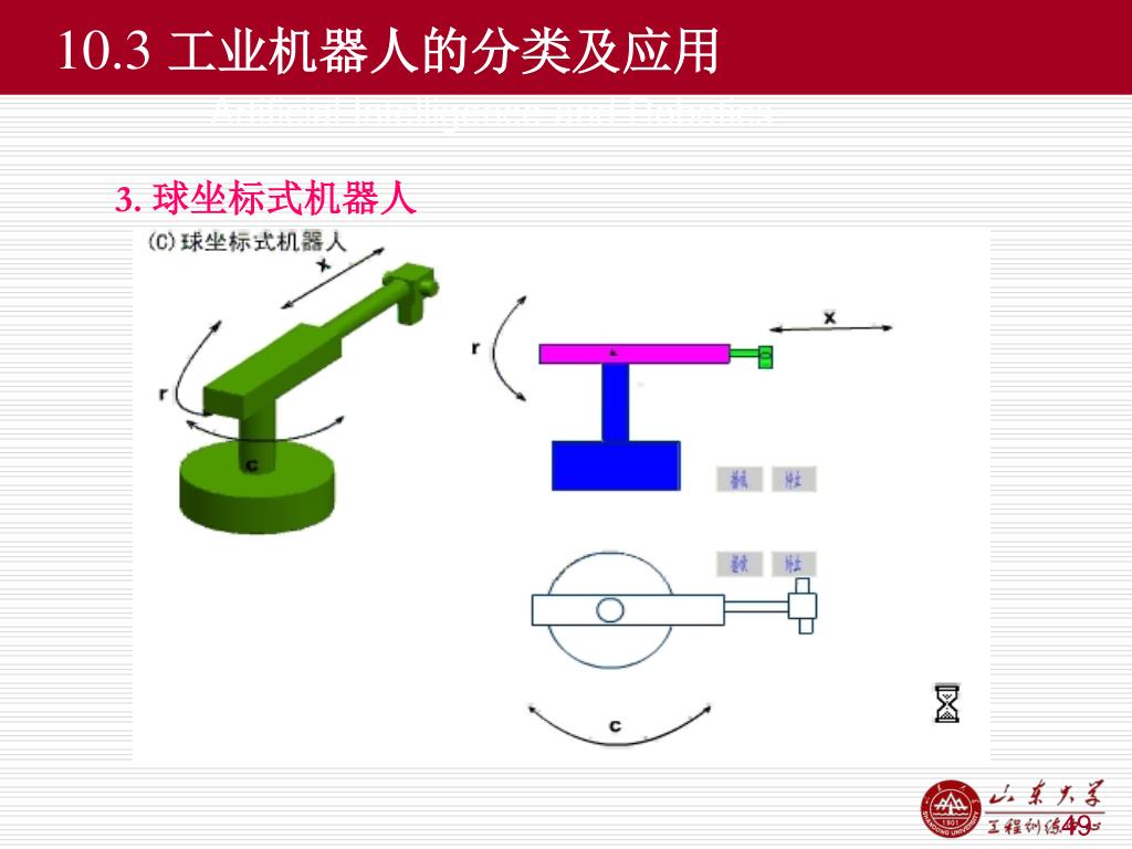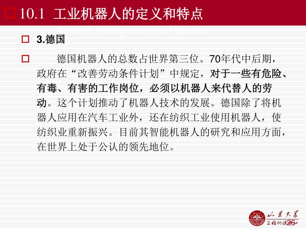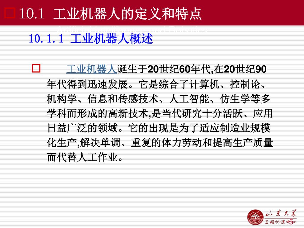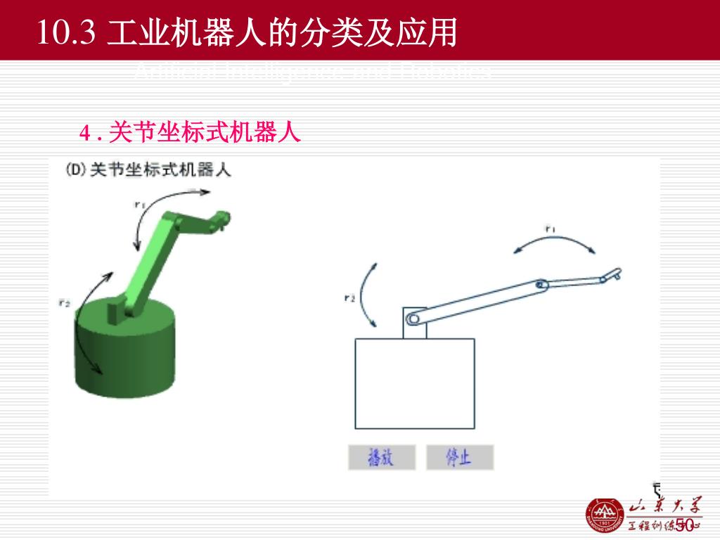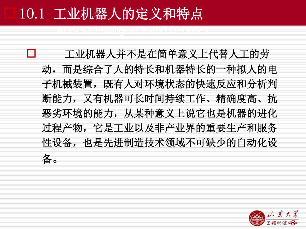Artificial Intelligence and Robotics. 山东大学创新教育通识核心课程 人工智能与机器人 cyj@sdu.edu.cn 86358137 、 88399323 山东大学. Artificial Intelligence and Robotics. 第 十章 工业机器人. Artificial Intelligence and Robotics. 第 十章 工业机器人. 10.1 工业机器人定义及特点 10.2 工业机器人基本组成及技术参数