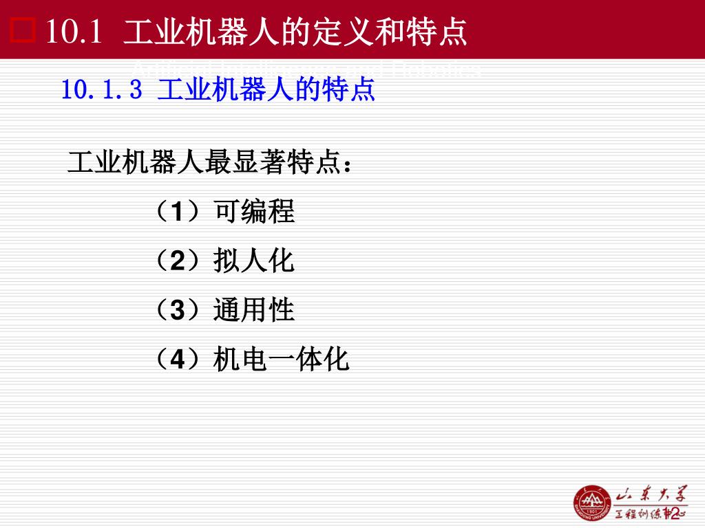 10.1 工业机器人的定义和特点 10.1.3 工业机器人的特点 工业机器人最显著特点: (1)可编程 (2)拟人化 (3)通用性 (4)机电一体化