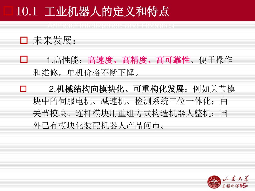 10.1 工业机器人的定义和特点 • 未来发展: • 1.高性能:高速度、高精度、高可靠性、便于操作和维修,单机价格不断下降。 • 2.机械结构向模块化、可重构化发展:例如关节模块中的伺服电机、减速机、检测系统三位一体化;由关节模块、连杆模块用重组方式构造机器人整机;国外已有模块化装配机器人产品问巿。
