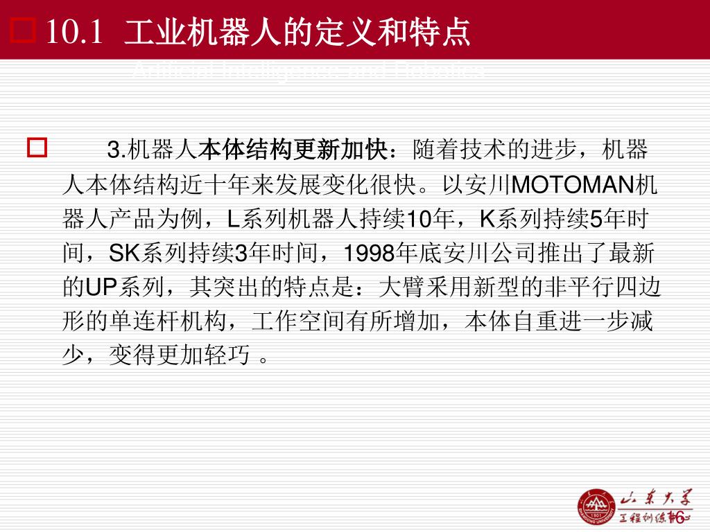 10.1 工业机器人的定义和特点 • 3.机器人本体结构更新加快:随着技术的进步,机器人本体结构近十年来发展变化很快。以安川MOTOMAN机器人产品为例,L系列机器人持续10年,K系列持续5年时间,SK系列持续3年时间,1998年底安川公司推出了最新的UP系列,其突出的特点是:大臂釆用新型的非平行四边形的单连杆机构,工作空间有所增加,本体自重进一步减少,变得更加轻巧 。