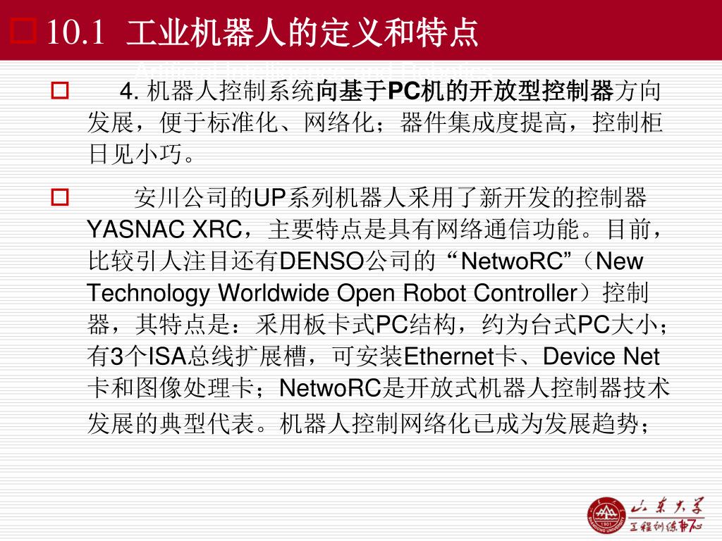 10.1 工业机器人的定义和特点 • 4. 机器人控制系统向基于PC机的开放型控制器方向发展,便于标准化、网络化;器件集成度提高,控制柜日见小巧。 • 安川公司的UP系列机器人釆用了新开发的控制器YASNAC XRC,主要特点是具有网络通信功能。目前,比较引人注目还有DENSO公司的“NetwoRC”(New Technology Worldwide Open Robot Controller)控制器,其特点是:釆用板卡式PC结构,约为台式PC大小;有3个ISA总线扩展槽,可安装Ethernet卡、Device Net卡和图像处理卡;NetwoRC是开放式机器人控制器技术发展的典型代表。机器人控制网络化已成为发展趋势;