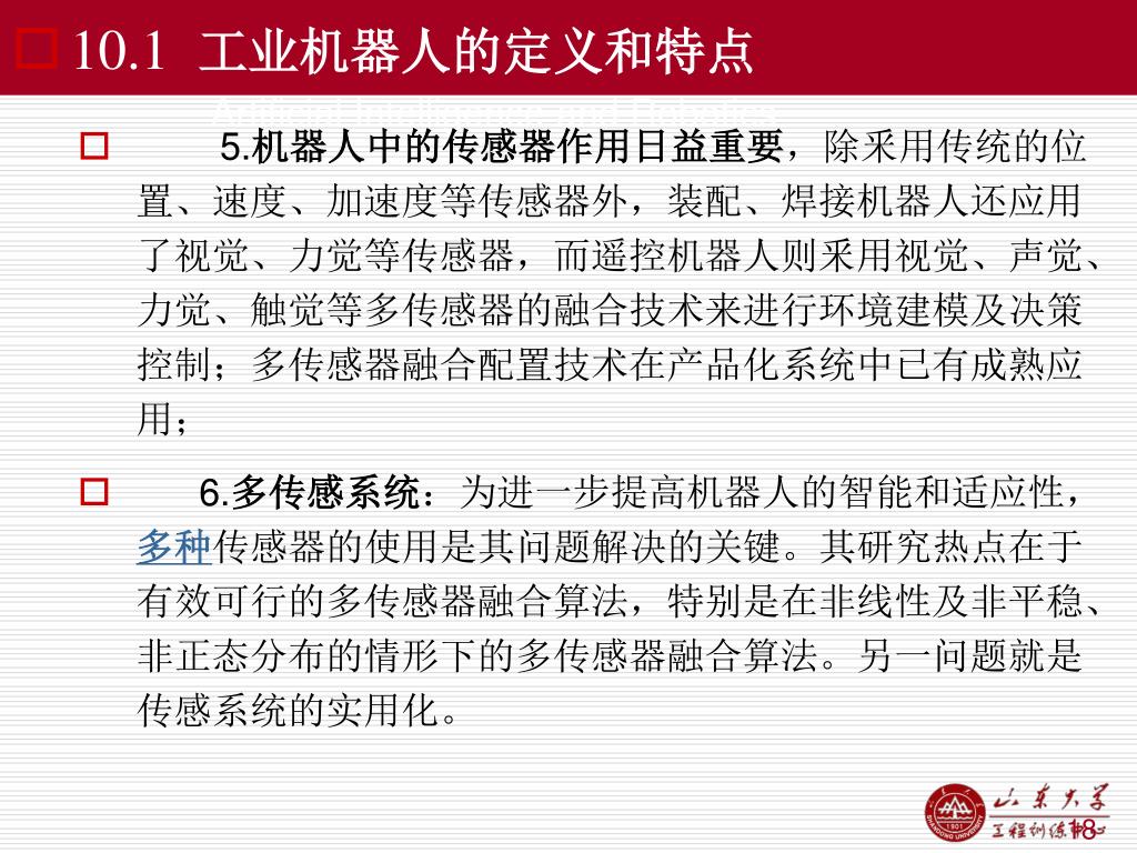 10.1 工业机器人的定义和特点 • 5.机器人中的传感器作用日益重要,除釆用传统的位置、速度、加速度等传感器外,装配、焊接机器人还应用了视觉、力觉等传感器,而遥控机器人则釆用视觉、声觉、力觉、触觉等多传感器的融合技术来进行环境建模及决策控制;多传感器融合配置技术在产品化系统中已有成熟应用; • 6.多传感系统:为进一步提高机器人的智能和适应性,多种传感器的使用是其问题解决的关键。其研究热点在于有效可行的多传感器融合算法,特别是在非线性及非平稳、非正态分布的情形下的多传感器融合算法。另一问题就是传感系统的实用化。