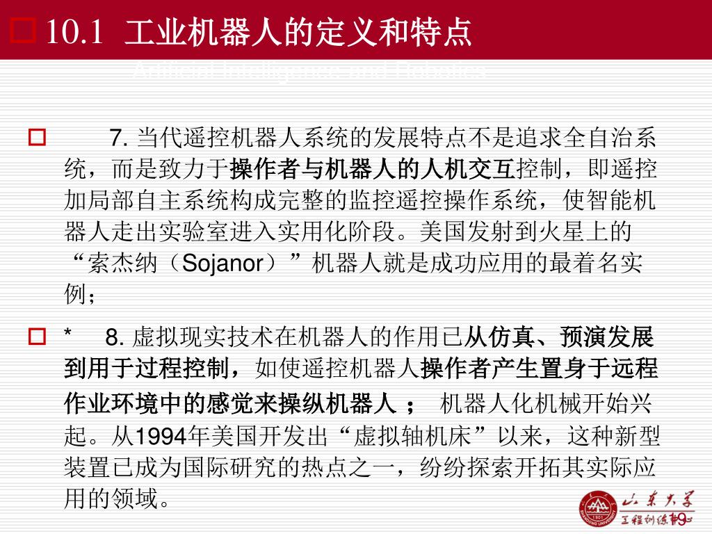 10.1 工业机器人的定义和特点 • 7. 当代遥控机器人系统的发展特点不是追求全自治系统,而是致力于操作者与机器人的人机交互控制,即遥控加局部自主系统构成完整的监控遥控操作系统,使智能机器人走出实验室进入实用化阶段。美国发射到火星上的“索杰纳(Sojanor)”机器人就是成功应用的最着名实例; • * 8. 虚拟现实技术在机器人的作用已从仿真、预演发展到用于过程控制,如使遥控机器人操作者产生置身于远程作业环境中的感觉来操纵机器人 ; 机器人化机械开始兴起。从1994年美国开发出“虚拟轴机床”以来,这种新型装置已成为国际研究的热点之一,纷纷探索开拓其实际应用的领域。