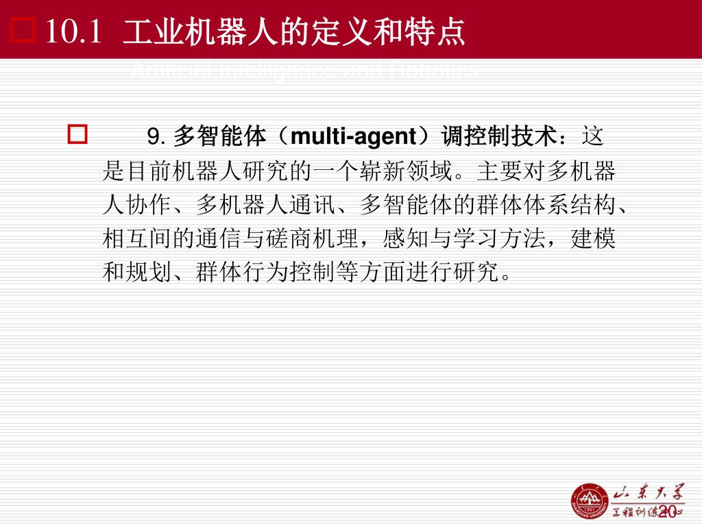 10.1 工业机器人的定义和特点 • 9. 多智能体(multi-agent)调控制技术:这是目前机器人研究的一个崭新领域。主要对多机器人协作、多机器人通讯、多智能体的群体体系结构、相互间的通信与磋商机理,感知与学习方法,建模和规划、群体行为控制等方面进行研究。