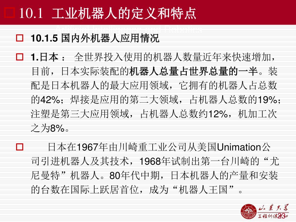 10.1 工业机器人的定义和特点 • 10.1.5 国内外机器人应用情况 • 1.日本 : 全世界投入使用的机器人数量近年来快速增加,目前,日本实际装配的机器人总量占世界总量的一半。装配是日本机器人的最大应用领域,它拥有的机器人占总数的42%;焊接是应用的第二大领域,占机器人总数的19%;注塑是第三大应用领域,占机器人总数约12%,机加工次之为8%。 • 日本在1967年由川崎重工业公司从美国Unimation公司引进机器人及其技术,1968年试制出第一台川崎的“尤尼曼特”机器人。80年代中期,日本机器人的产量和安装的台数在国际上跃居首位,成为“机器人王国”。