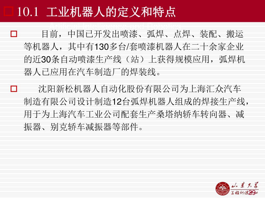 10.1 工业机器人的定义和特点 • 目前,中国已开发出喷漆、弧焊、点焊、装配、搬运等机器人,其中有130多台/套喷漆机器人在二十余家企业的近30条自动喷漆生产线(站)上获得规模应用,弧焊机器人已应用在汽车制造厂的焊装线。 • 沈阳新松机器人自动化股份有限公司为上海汇众汽车制造有限公司设计制造12台弧焊机器人组成的焊接生产线,用于为上海汽车工业公司配套生产桑塔纳轿车转向器、减振器、别克轿车减振器等部件。