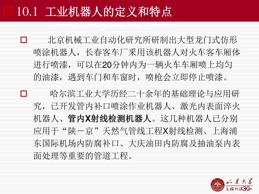 10.1 工业机器人的定义和特点 • 北京机械工业自动化研究所研制出大型龙门式仿形喷涂机器人,长春客车厂釆用该机器人对火车客车厢体进行喷漆,可以在20分钟内为一辆火车车厢喷上均匀的油漆,遇到车门和车窗时,喷枪会立即停止喷漆。 • 哈尔滨工业大学历经二十余年的基础理论与应用研究,已开发管内补口喷涂作业机器人、激光内表面淬火机器人、管内X射线检测机器人。这几种机器人已分别应用于“陕-京”天然气管线工程X射线检测、上海浦东国际机场内防腐补口、大庆油田内防腐及抽油泵内表面处理等重要的管道工程。