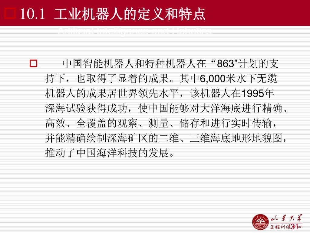 10.1 工业机器人的定义和特点 • 中国智能机器人和特种机器人在“863”计划的支持下,也取得了显着的成果。其中6,000米水下无缆机器人的成果居世界领先水平,该机器人在1995年深海试验获得成功,使中国能够对大洋海底进行精确、高效、全覆盖的观察、测量、储存和进行实时传输,并能精确绘制深海矿区的二维、三维海底地形地貌图,推动了中国海洋科技的发展。
