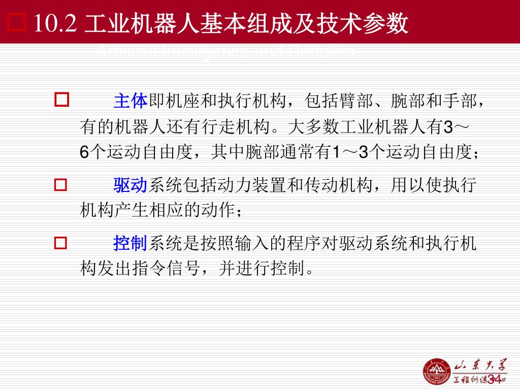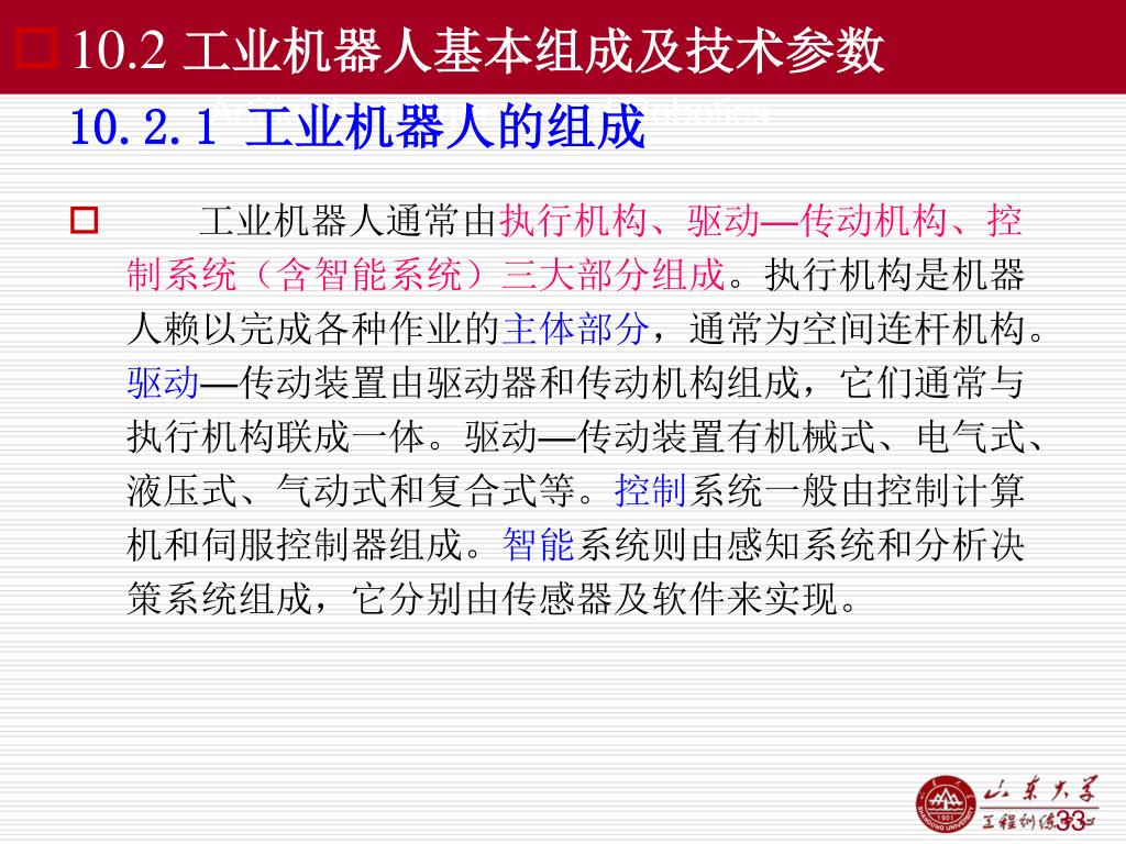 10.2 工业机器人基本组成及技术参数 • 主体即机座和执行机构,包括臂部、腕部和手部,有的机器人还有行走机构。大多数工业机器人有3~6个运动自由度,其中腕部通常有1~3个运动自由度; • 驱动系统包括动力装置和传动机构,用以使执行机构产生相应的动作; • 控制系统是按照输入的程序对驱动系统和执行机构发出指令信号,并进行控制。