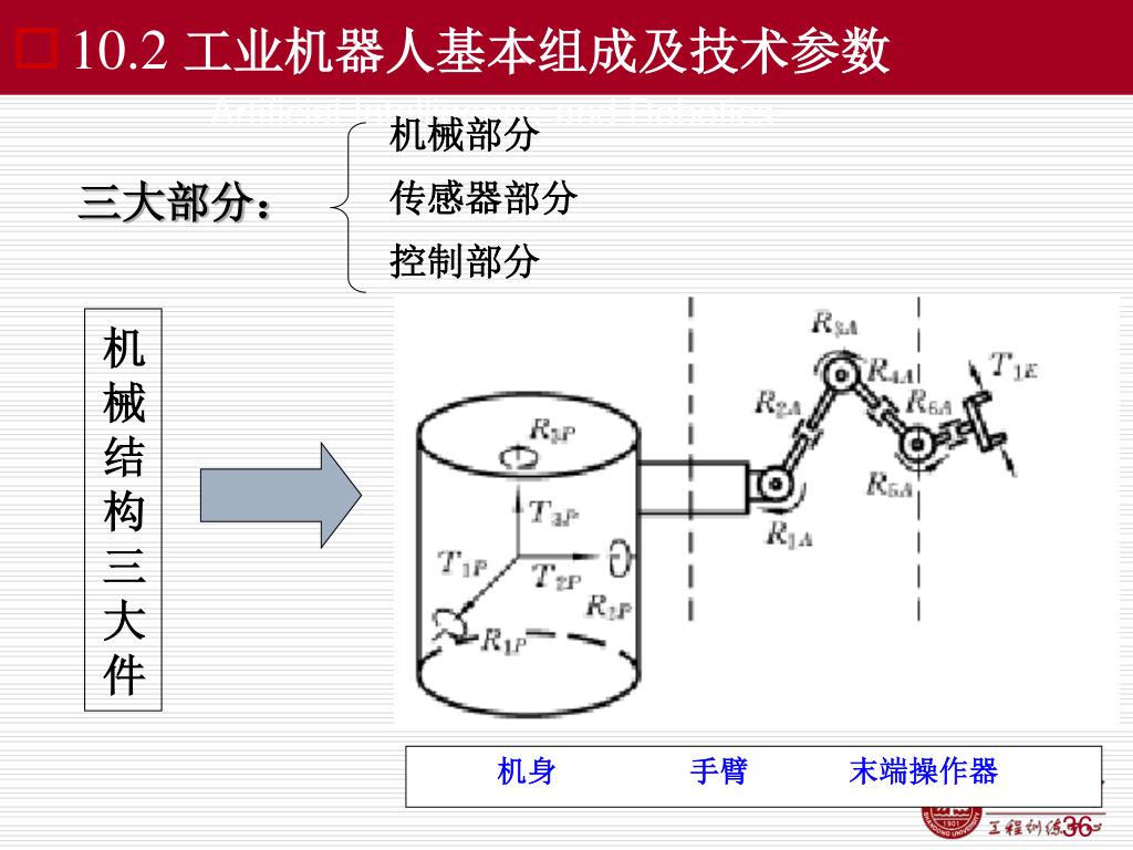 10.2 工业机器人基本组成及技术参数 机械部分 传感器部分 控制部分 三大部分: 机 械 结 构 三 大 件 机身 手臂 末端操作器